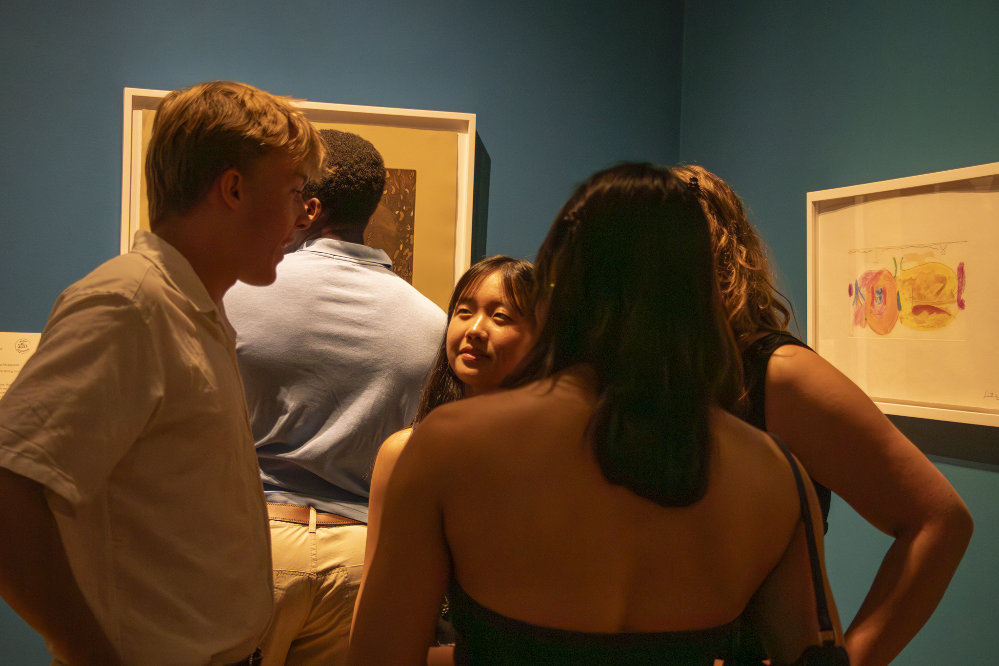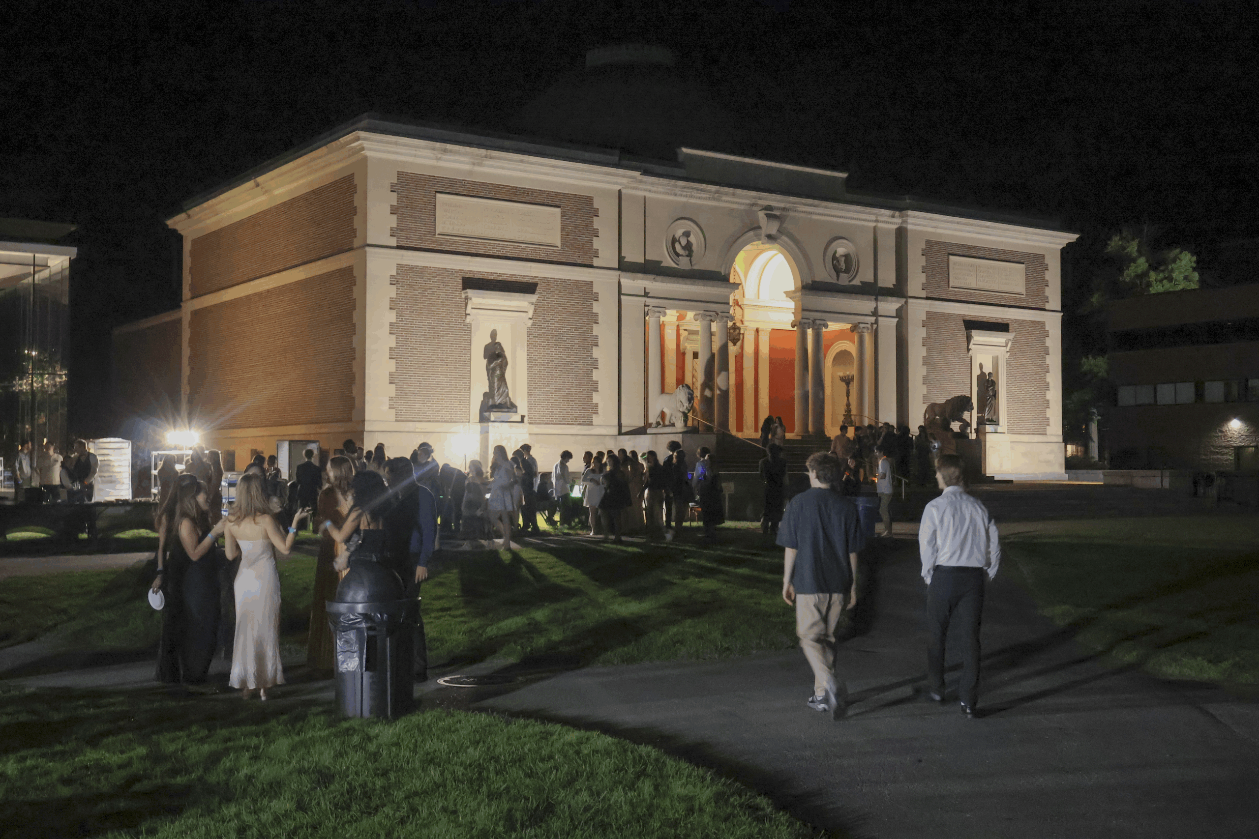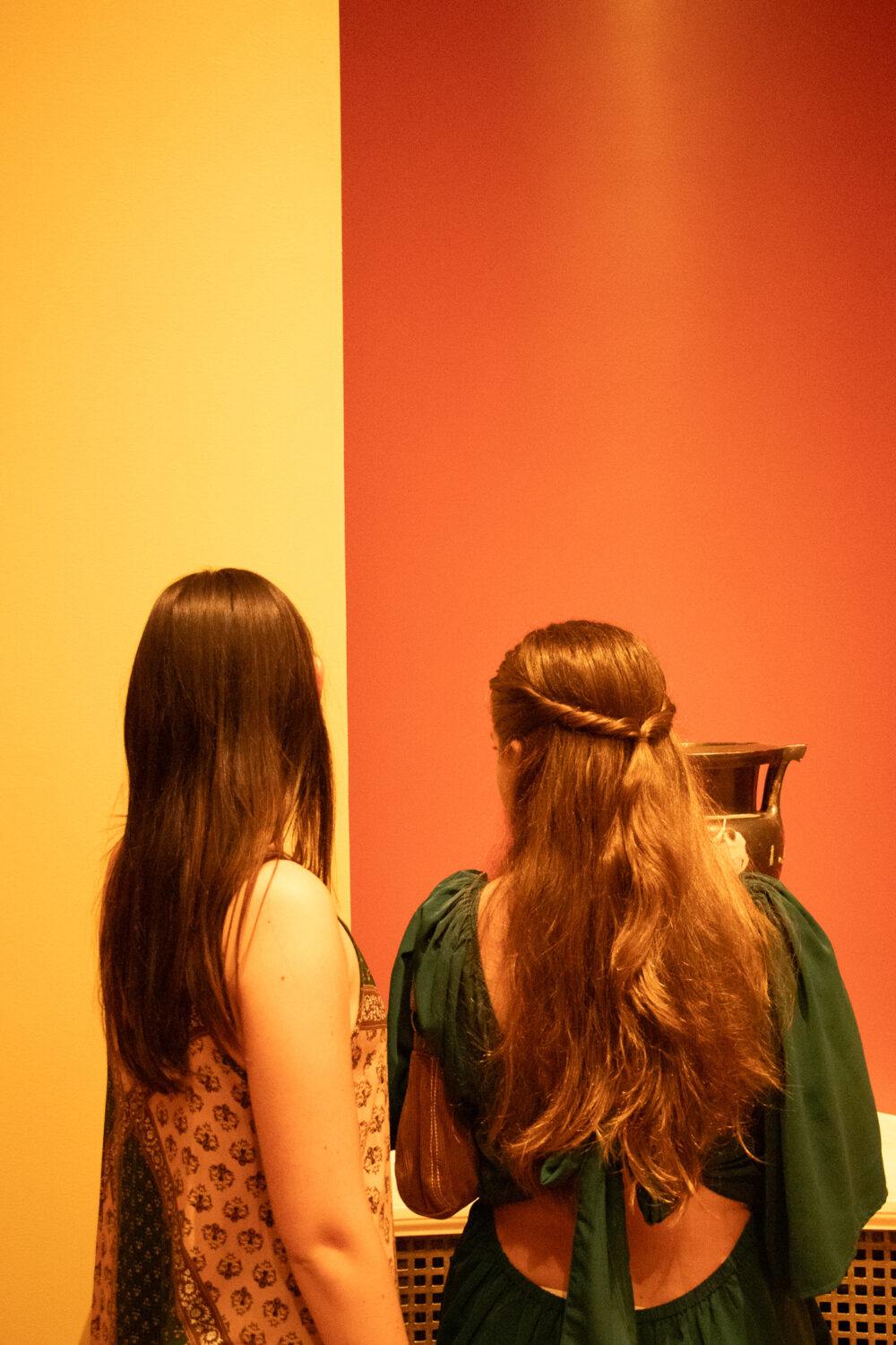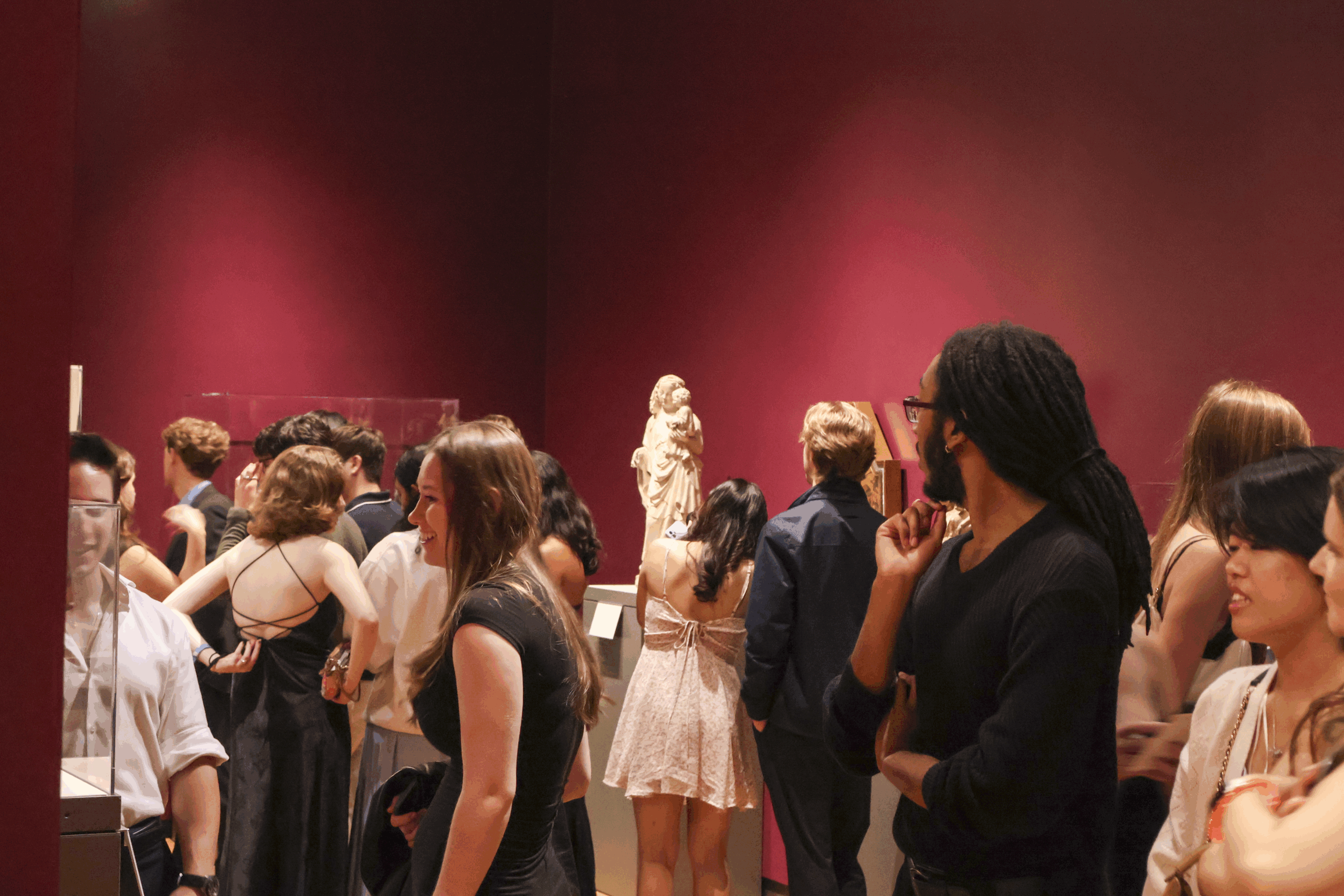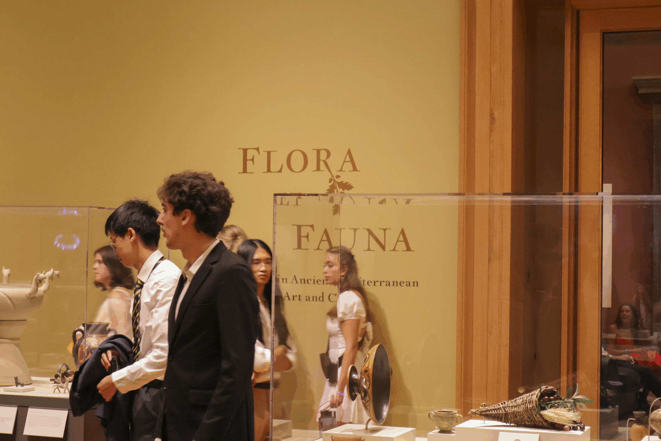 Some Friday evening deep into the throes of each semester, cocktail dresses, wrinkled suits and funky corduroy pants find an occasion to emerge: Student Night at the Museum. Among charcuterie spreads and a bar calling back to some Great Gatsbyian image of luxury, students gather under the pretense of seeing art. The event is better described as a sort of performative contemplation, often under the influence of some tasteful imbibing and in the jovial company of friends. Photographs abound—both sprawling across the exhibition walls and posed artfully among statues, lions and imposing portraits. From Lois Langbein, the wonderfully inviting security guard, to the crowds milling about increasingly cramped gallery spaces or dodging runaway sprinklers, this mosaic of moments seeks to create a stained glass window of the weekend: vibrant, glittering alive.