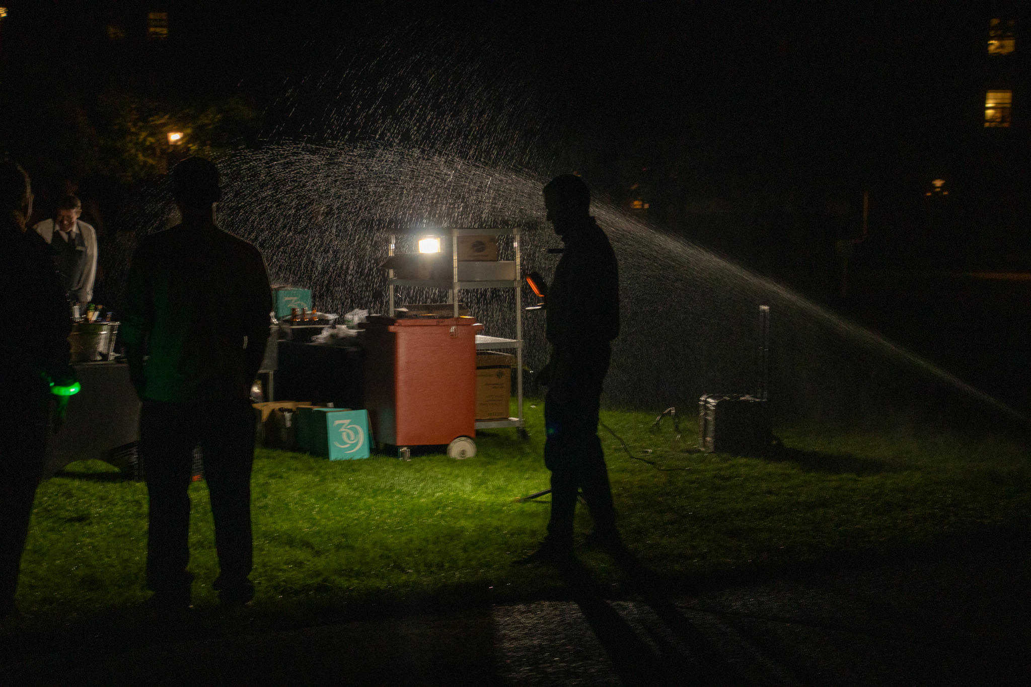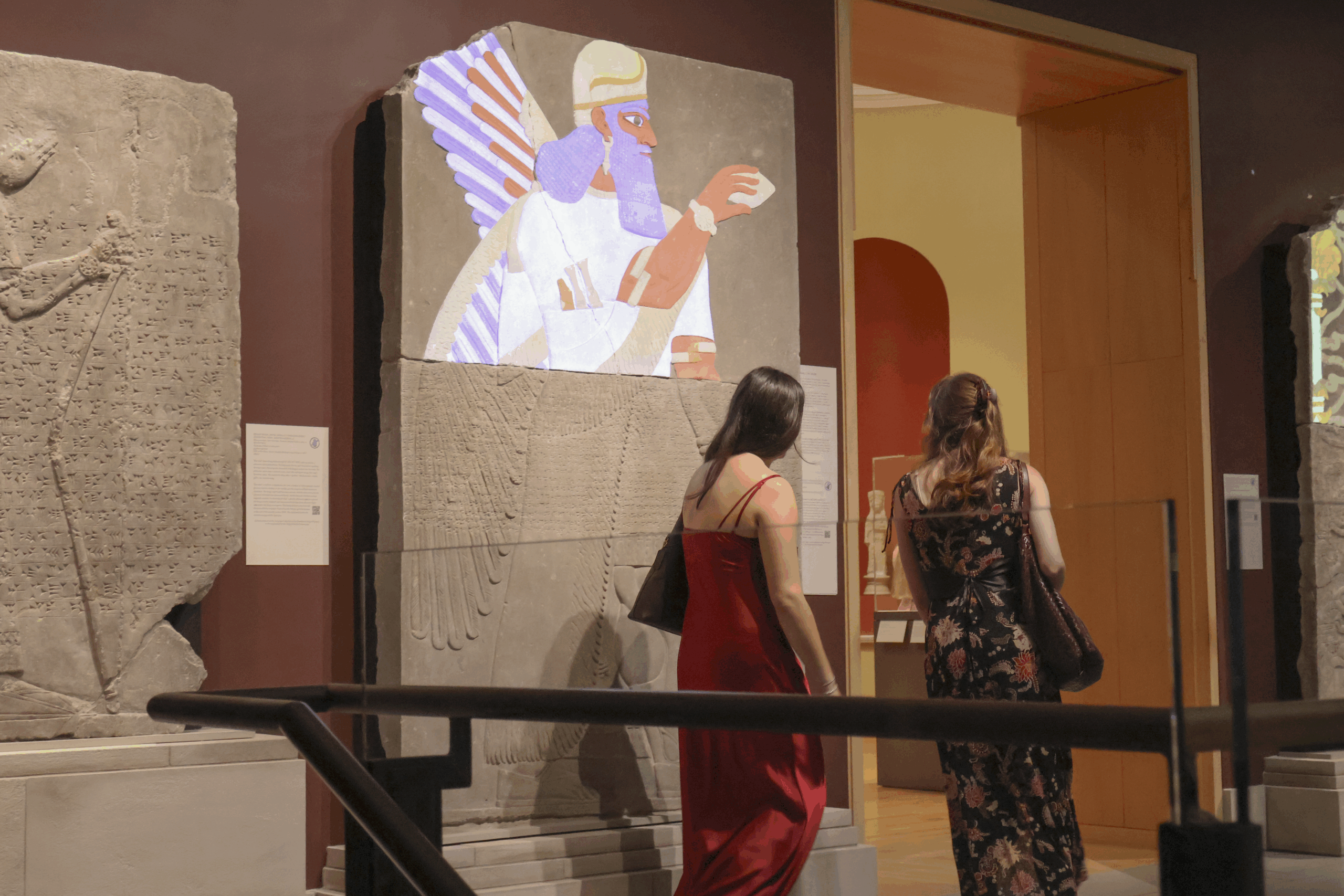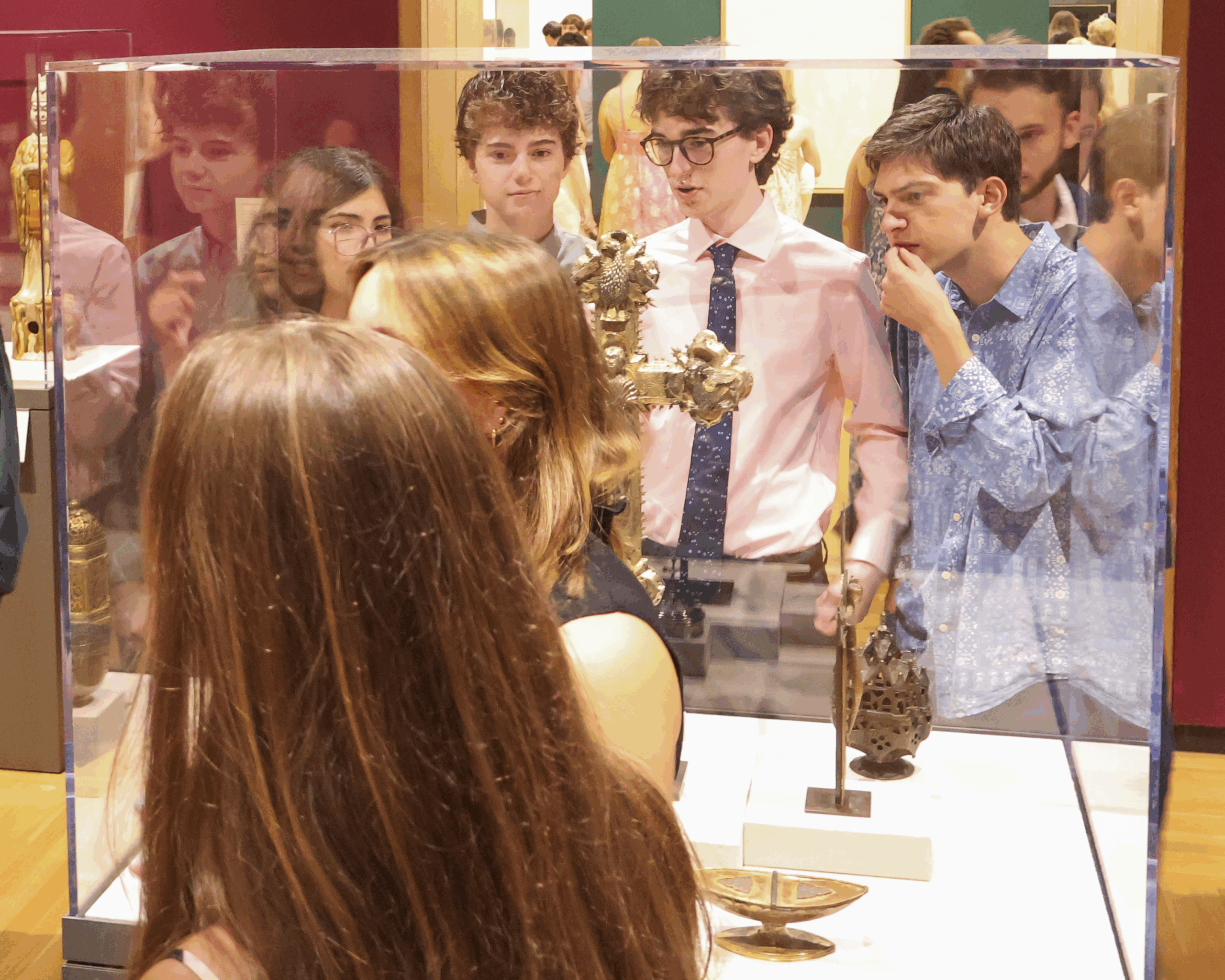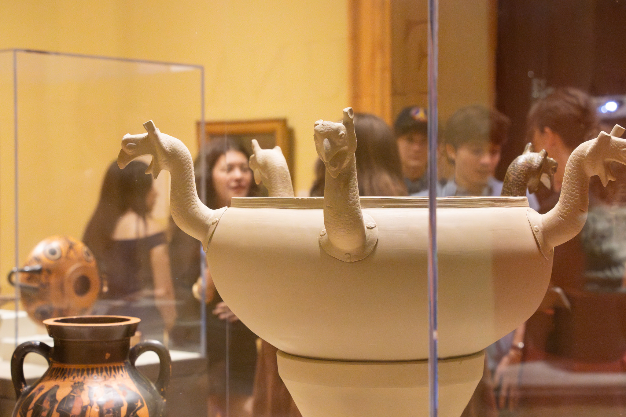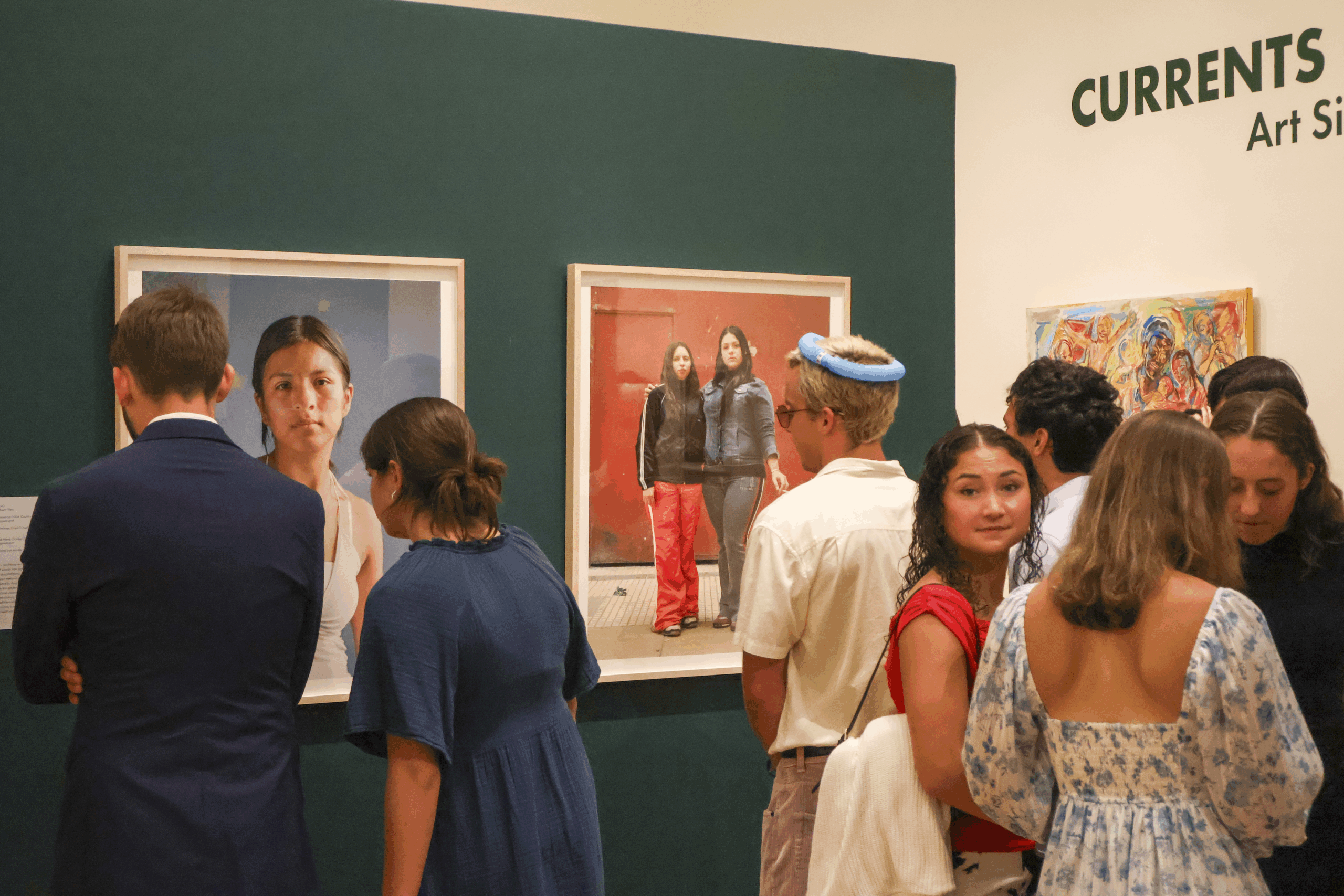 Some Friday evening deep into the throes of each semester, cocktail dresses, wrinkled suits and funky corduroy pants find an occasion to emerge: Student Night at the Museum. Among charcuterie spreads and a bar calling back to some Great Gatsbyian image of luxury, students gather under the pretense of seeing art. The event is better described as a sort of performative contemplation, often under the influence of some tasteful imbibing and in the jovial company of friends. Photographs abound—both sprawling across the exhibition walls and posed artfully among statues, lions and imposing portraits. From Lois Langbein, the wonderfully inviting security guard, to the crowds milling about increasingly cramped gallery spaces or dodging runaway sprinklers, this mosaic of moments seeks to create a stained glass window of the weekend: vibrant, glittering alive.
