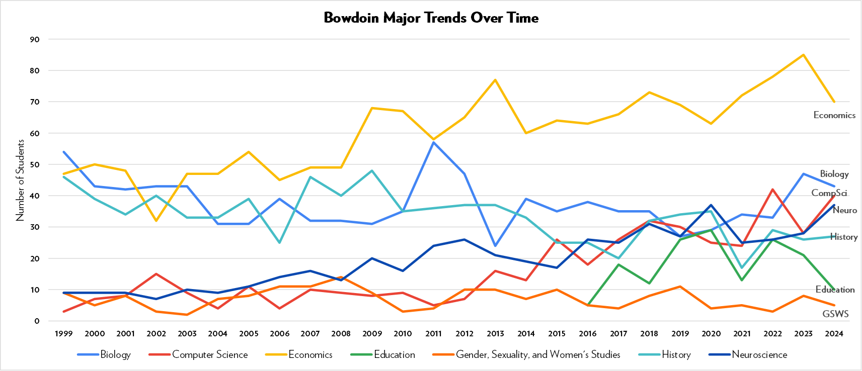 Majors have soared and declined in enrollment over the last 25 years at Bowdoin, changing how students engage with the liberal arts education. The Bowdoin Orient compiled data from 1999-2024 to understand trends in major enrollment and gather perspectives of students, faculty and alumni.