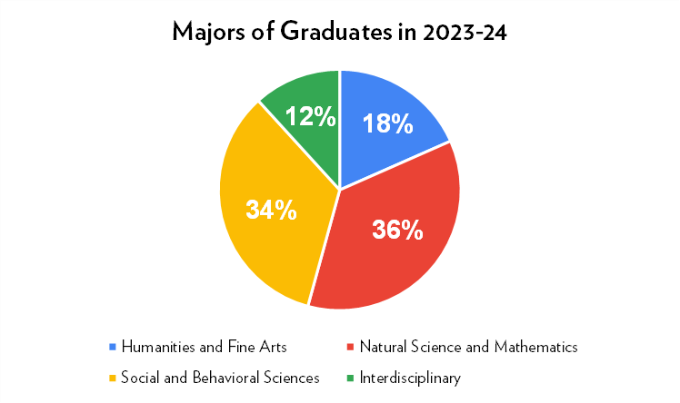 The College breaks down its majors, minors and programs into four divisions: Humanities and Fine Arts, Natural Science and Mathematics, Social and Behavioral Sciences, and Interdepartmental and Interdisciplinary. For 2024, the most recent year for which this data is available, Natural Science and Mathematics made up 36 percent of graduates’ majors, Social and Behavioral Sciences 34 percent, Humanities and Fine Arts 18 percent, and Interdepartmental and Interdisciplinary 12 percent. The College has seen growth in “STEM” (Science, Technology, Engineering and Math) majors, often coinciding with decreasing enrollment in the humanities.