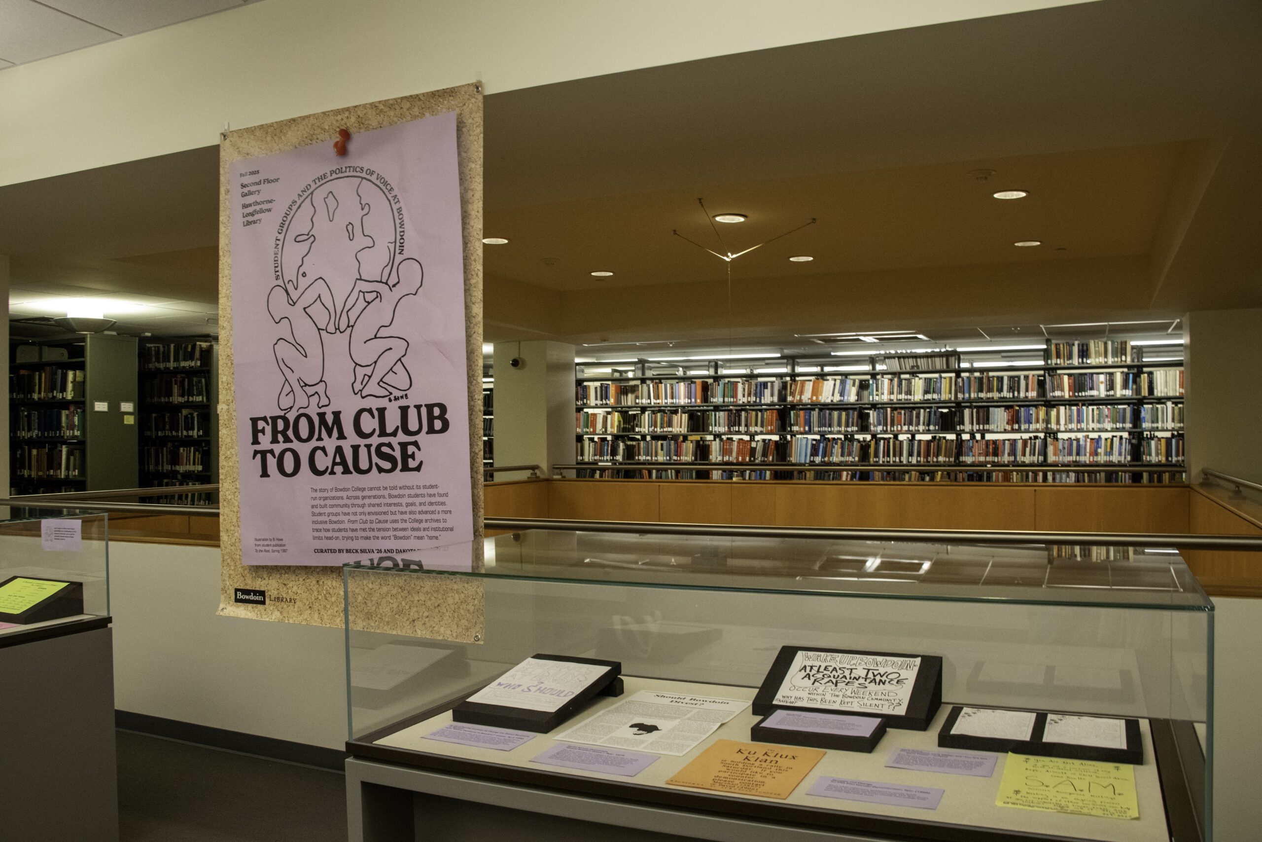 Last Friday, community members gathered on the second floor of the Hawthorne-Longfellow Library to celebrate the opening of the fall 2025 exhibit, “From Club to Cause: Student Groups and the Politics of Voice at Bowdoin.”