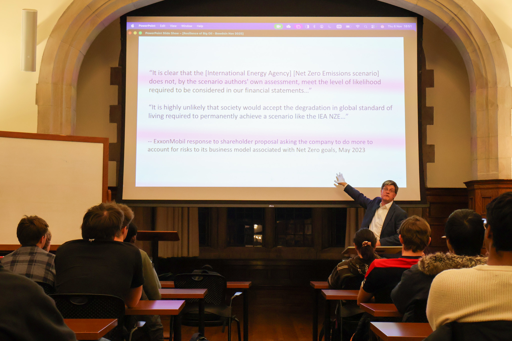 Abigail HebertOn Thursday night, Stefan Andreasson, reader in comparative politics at Queen’s University Belfast, delivered a lecture unpacking the dominance of Exxon Mobil in the American and global oil industries. Andreasson examined Exxon Mobil’s commitment to growing its oil and gas production as peer companies in Europe look to transition to renewable energy.