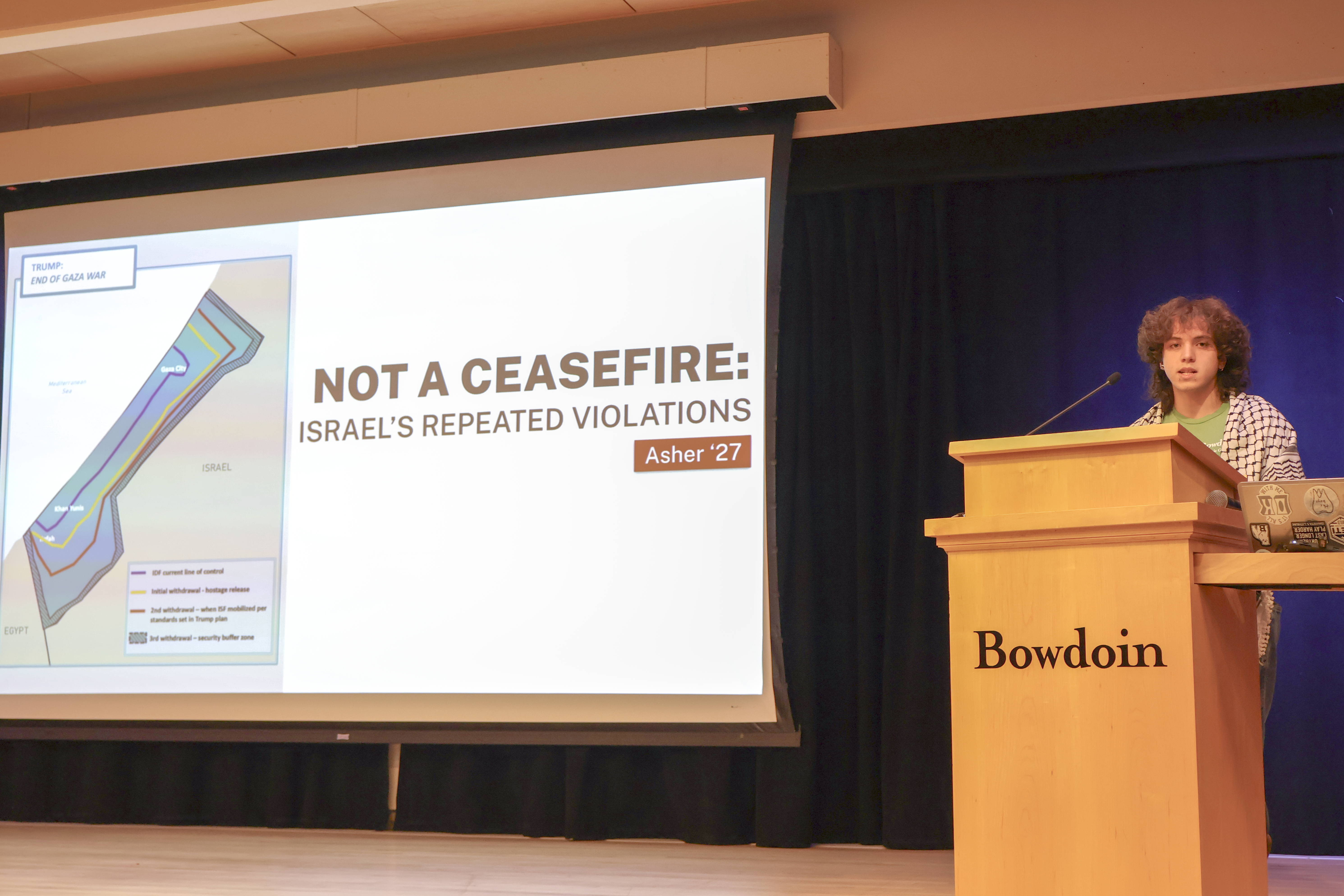 Isa CruzLast night, retired Lieutenant Colonel Katie Petronio ’07 and United States Marine Corps (USMC) ground intelligence officer Quincy Leech ’17 returned to campus to reflect on their service and deployment in the Marines. Gill Barndollar ’04, a former USMC infantry officer and co-founder of the Bowdoin Marine Corps Society, moderated the discussion, which was held in Kresge Auditorium.