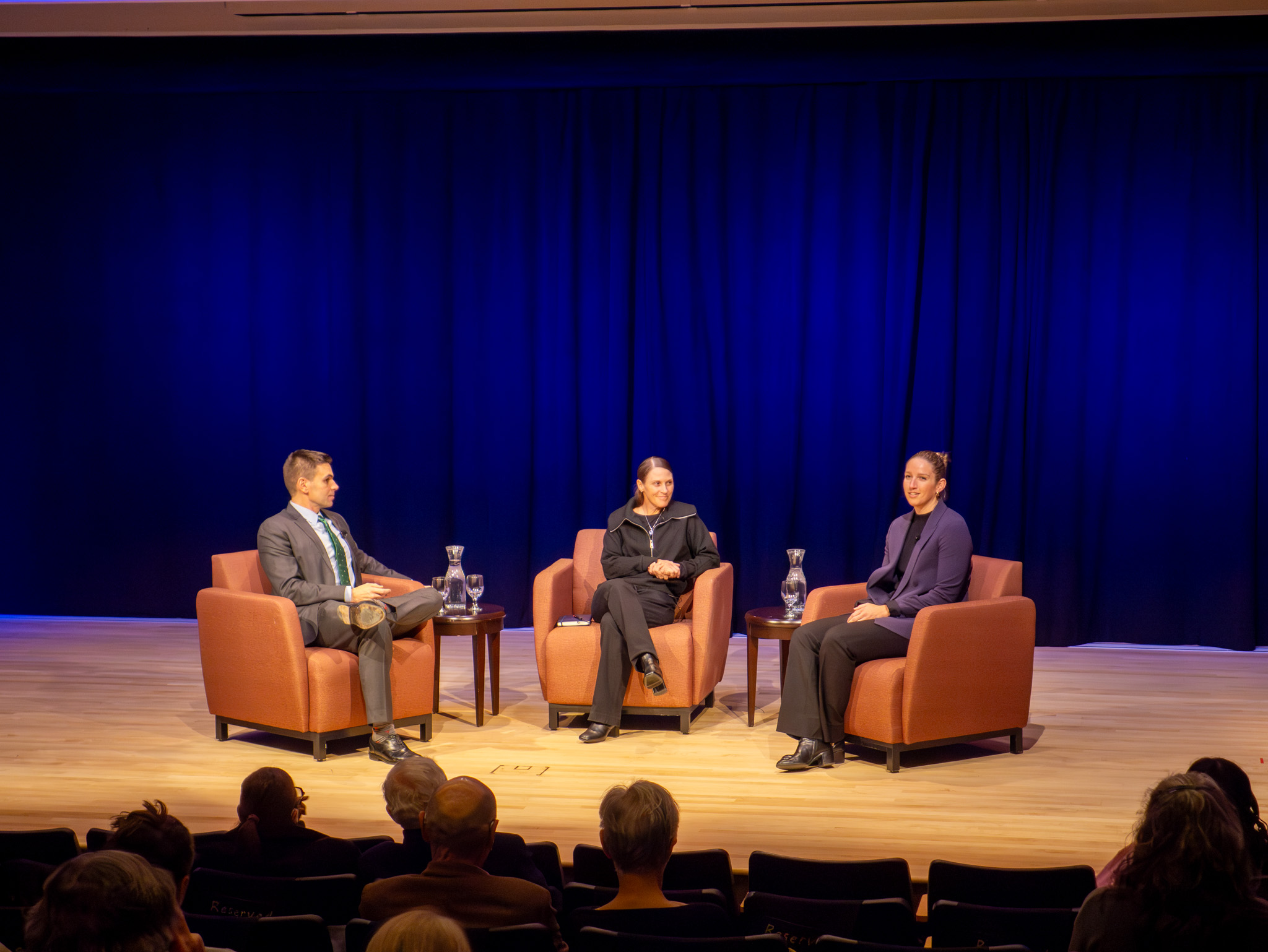 Barndollar also asked Leech and Petronio how their experience at Bowdoin prepared them for their time in the Marines. Leech found the variety of perspectives she encountered at Bowdoin especially helpful in equipping her to make difficult decisions.