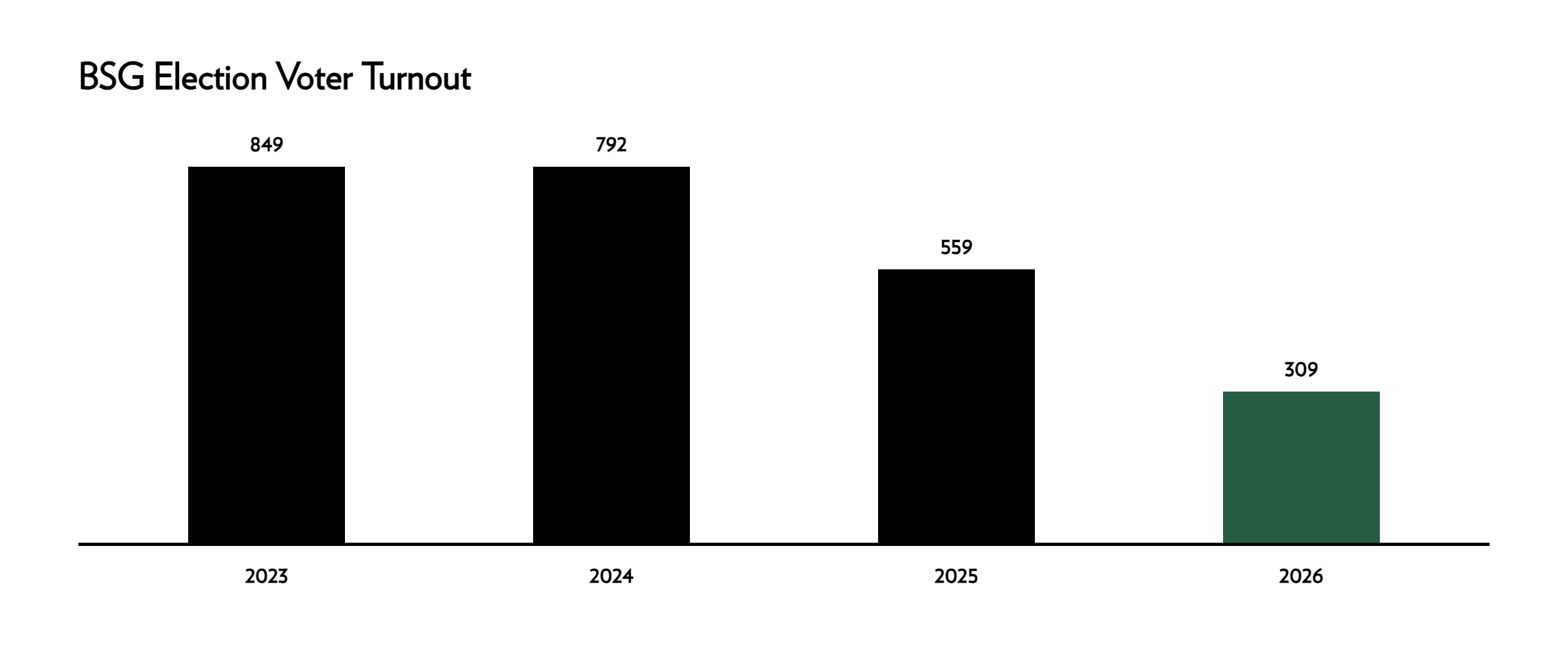 The election sharpened a decline in voter turnout that has developed over the past several years. 309 ballots were cast, a little more than half of the 559 votes cast last year. Turnout was as high as 849 in 2023 and reached over half the student body prior to the onset of the Covid-19 pandemic.