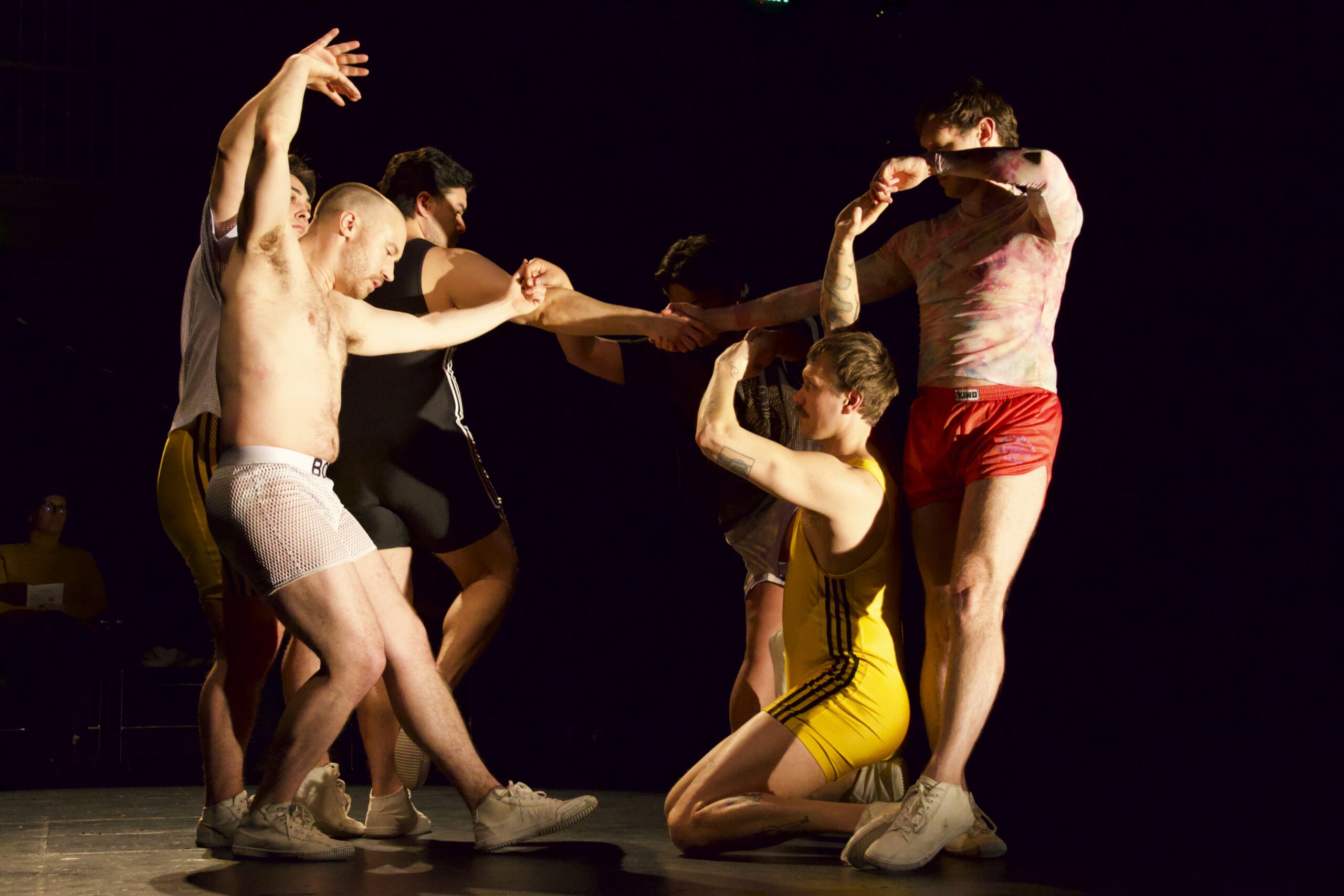 Before the performance began, dancers were already moving as the audience entered the theater. The piece then moved through multiple stages, featuring a monologue and a song by one of the dancers, an extended period in which the dancers held hands and moved in an amorphous mass and improvisation near the end.