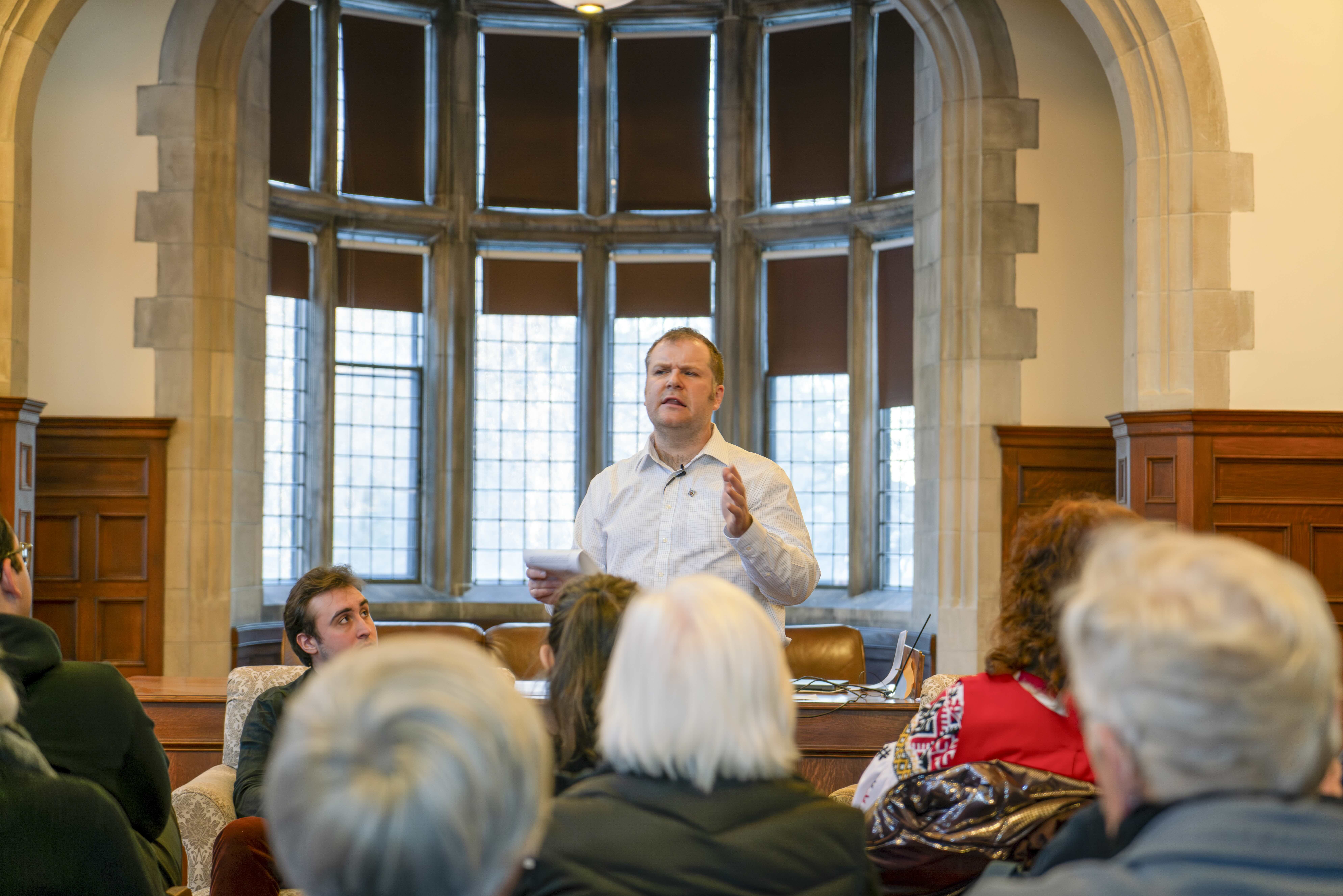 Following these recorded messages, Brian Milakovsky, a researcher and expert on economic recovery in Ukraine, joined BfU student organizer Volodymyr Zadorojny ’27 to discuss the war’s political and economic implications and pathways to the conflict’s end.