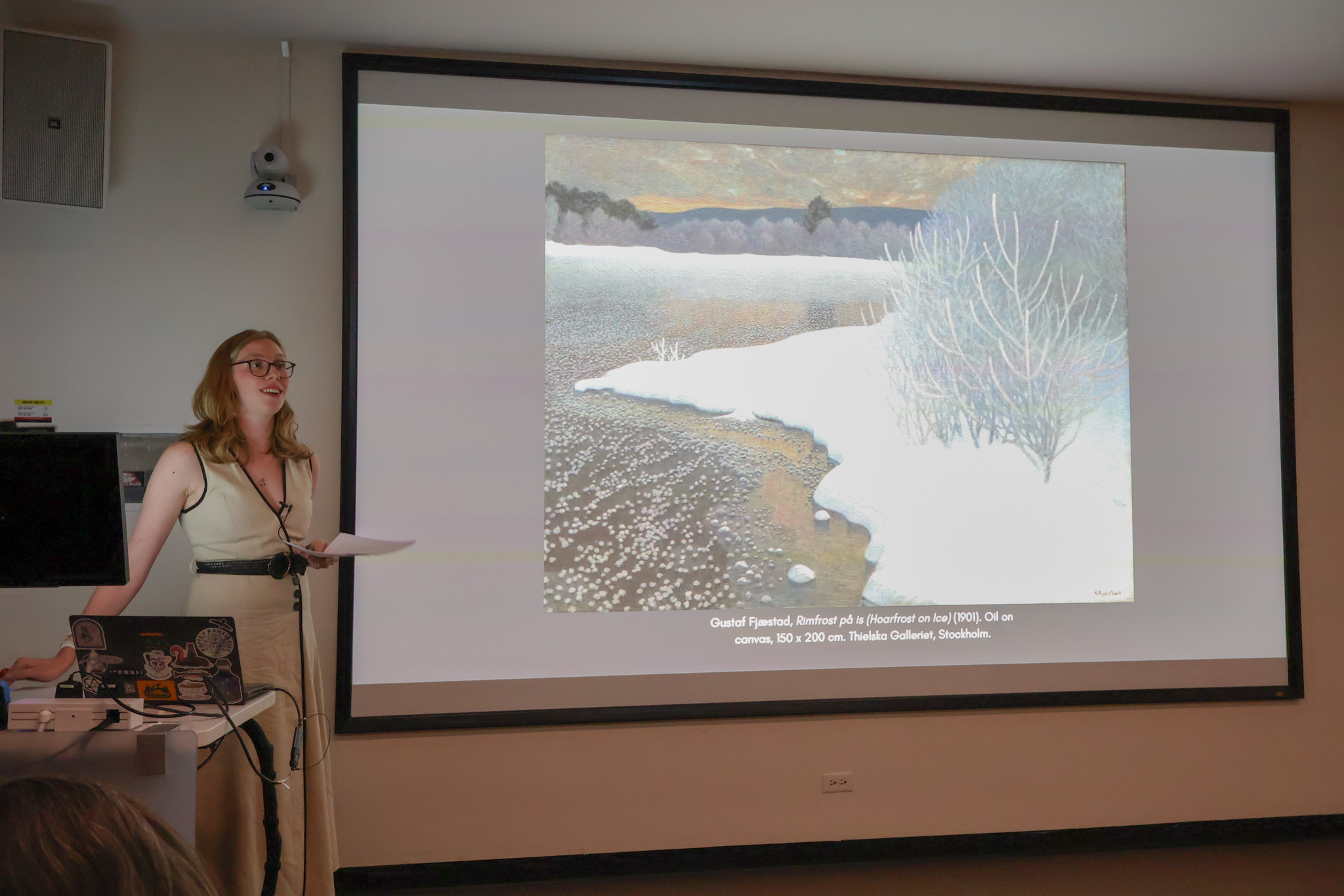 Abigail HebertBRIDGING THE GAP(P): Dr. Isabelle Gapp delivers her talk on the work of Anna Boberg, illuminating the connection between Boberg’s painting, titled “The Blue Roof,” and many of Bowdoin’s academic departments.