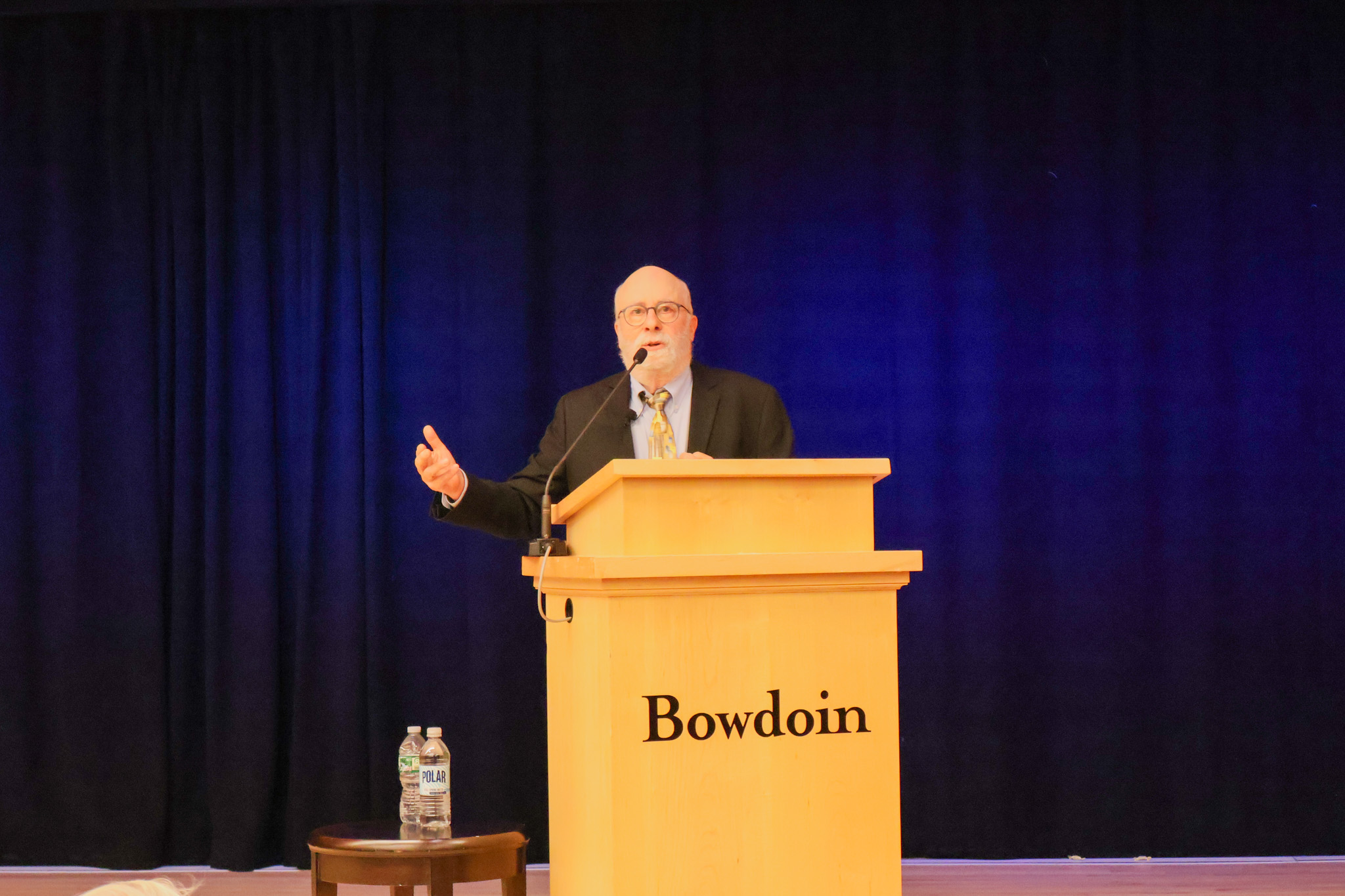Abigail HebertMAINE V. DARK MONEY: Lawrence Lessig speaks in Kresge Auditorium on Wednesday night. Lessig, a Harvard Law professor and founder of the non-profit Equal Citizens, spoke about a novel legal strategy Equal Citizens is using to attempt to uphold Maine’s regulation of super PACs.