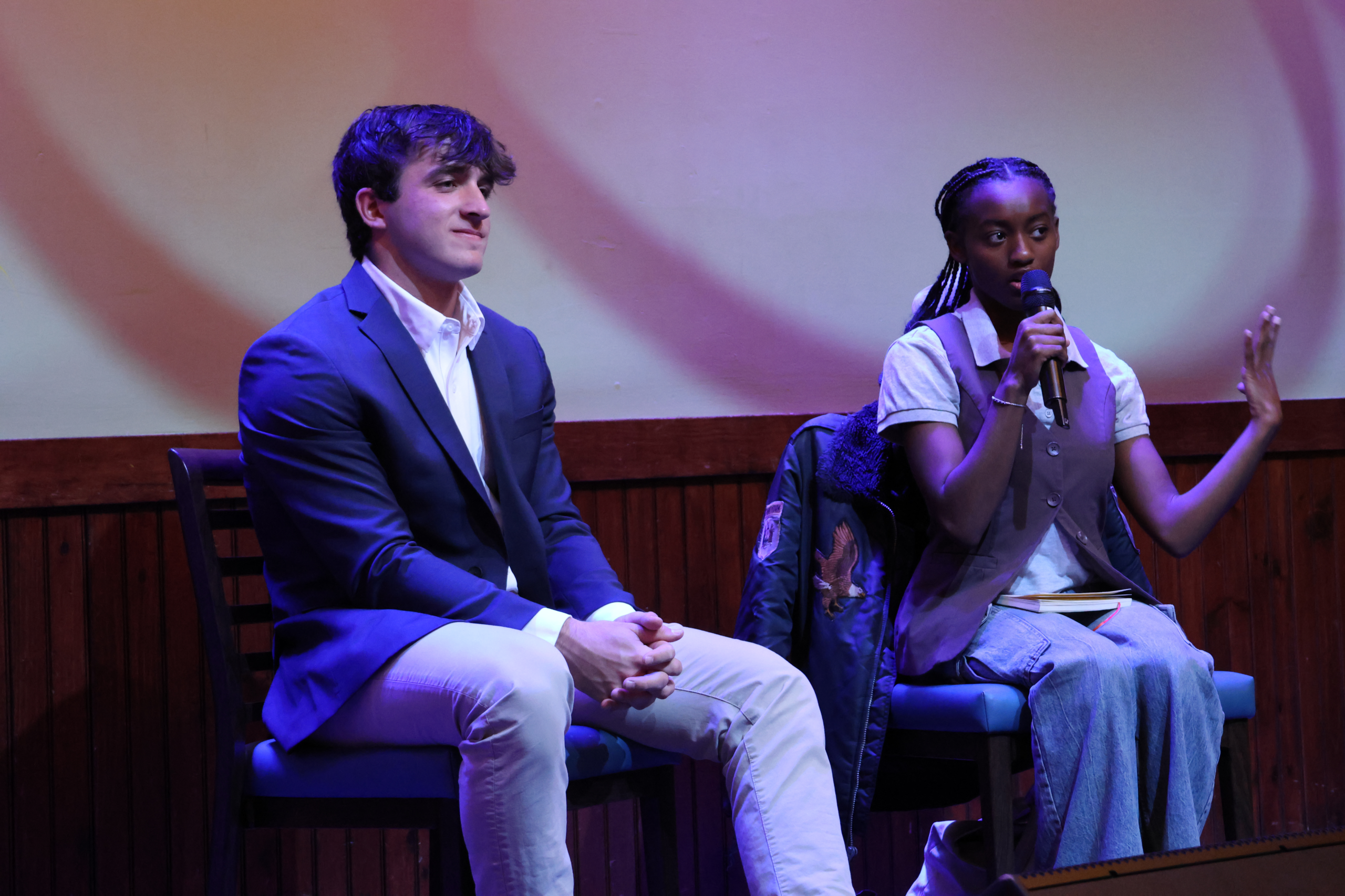 Addison MoorePUB POLITICS: Aidan Aybar ’28 and Angelica Gordon ’27, this year’s candidates for BSG president, debate on Wednesday night in the Pub. Aybar and Gordon discussed their platforms and what they each see as BSG’s role on Bowdoin’s campus.