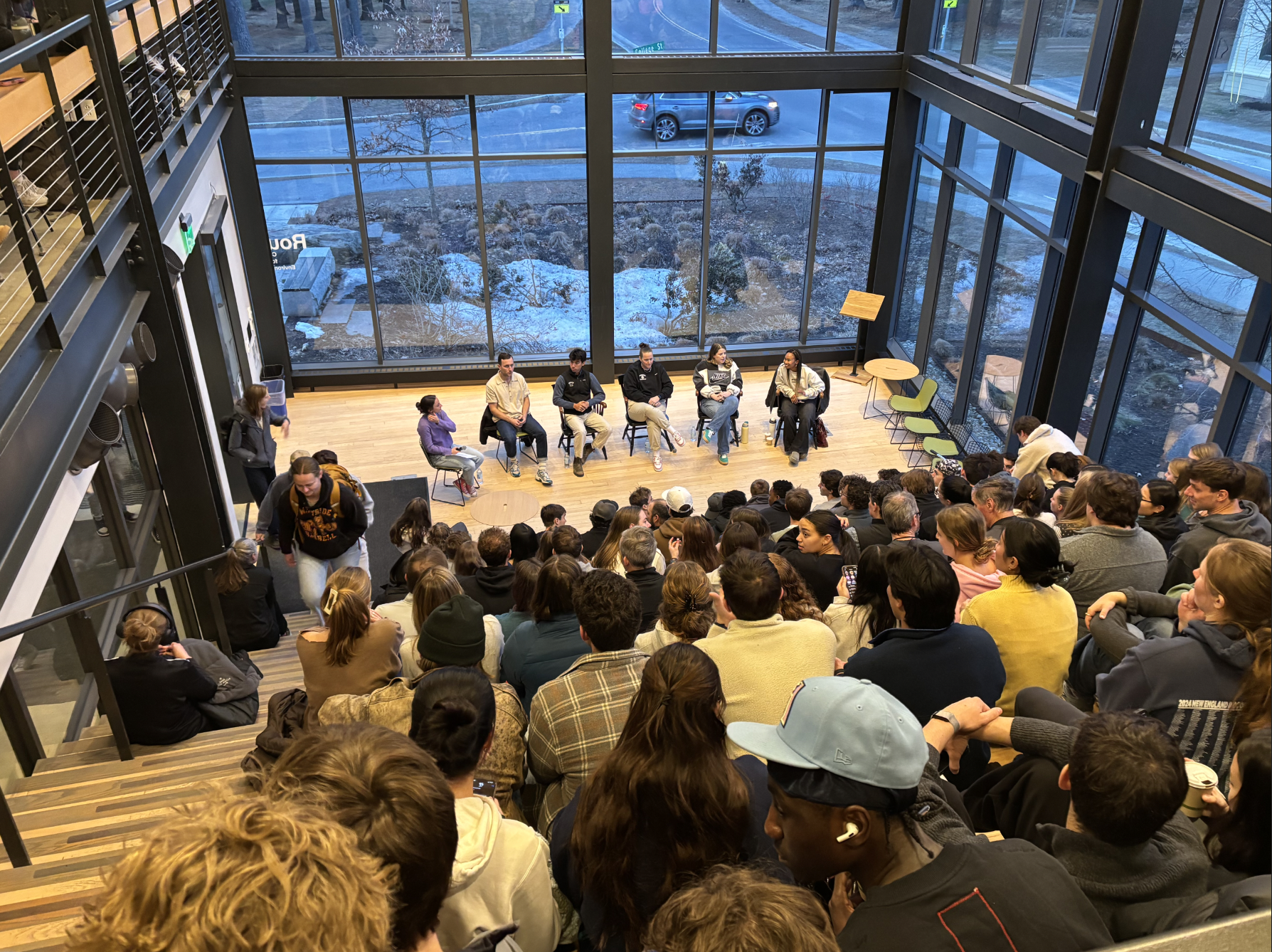 Addison MooreCOMMUNITY FIRST: Students gather in Roux to hear from a voracious group of panelists regarding LGBTQ+ experiences within athlete communities. Ben Chadwick ’11, an alum of the men’s lacrosse team, was one of the main speakers.
