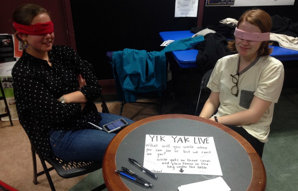 If you were moseying by Bowdoin Express, known to students as the C-store, on Monday evening, you may have seen two delirious short-haired gals wearing blindfolds and soliciting your participation in our latest project: “Yik Yak Live.” But we did not see you.