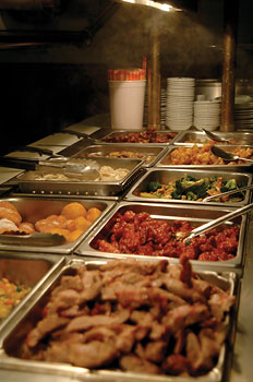 For a well-lit, social, café-like feel, head past the buffet toward the picture windows, where you can enjoy your meal and a view of the gas station. For quieter and more dimly lit dining, duck through the archway to the right and into the main seating area. There are a few tables to the left on an elevated platform surrounded by half walls, providing for optimal intimacy. But, if you're purely in it for the grub, there is plenty of seating right next to the buffet, so that you won't have to waste any extra calories walking back and forth.
