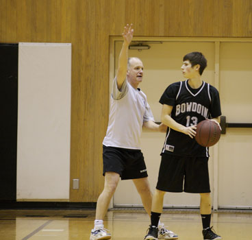 Bowdoin students defeated the faculty team in a close game on Wednesday, in the first students-versus-faculty basketball game, sponsored by the Bowdoin Men's Tennis Team.