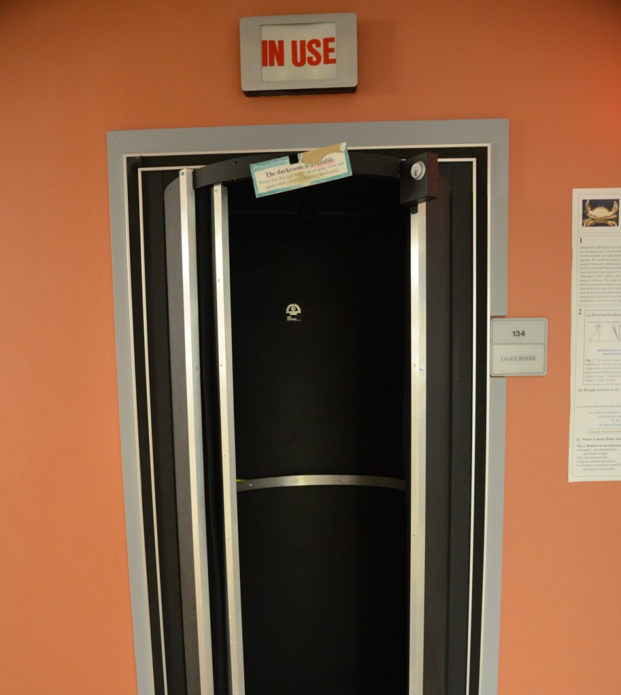 Determined, I see the loop-hole: I will somehow get to the UV machine in the dark room, place my gel in the required spot, and take the necessary measurements all without turning on the lights and disrupting the photographer. Improvisation at its best.